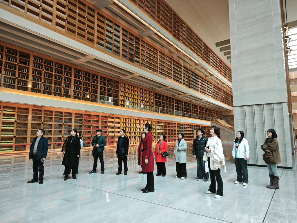 西安国家版本馆作为中国国家版本馆“一总三分”体系的西北核心枢纽,既是收藏、保护、研究中华文化版本的“文明种子库”,更是传承红色基因、弘扬革命文化的重要阵地。步入馆区,入口处12根雕刻着甲骨、青铜、竹简等版本载体演变的文化柱,仿佛铺就了一条穿越千年的“文明长廊”,让师生们在踏入场馆之初便感受到中华文明“薪火相传、从未中断”的厚重底蕴。