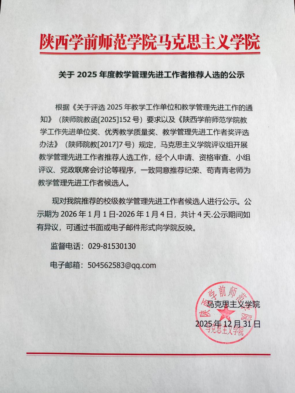 关于2025年度教学管理先进工作者推荐人选的公示