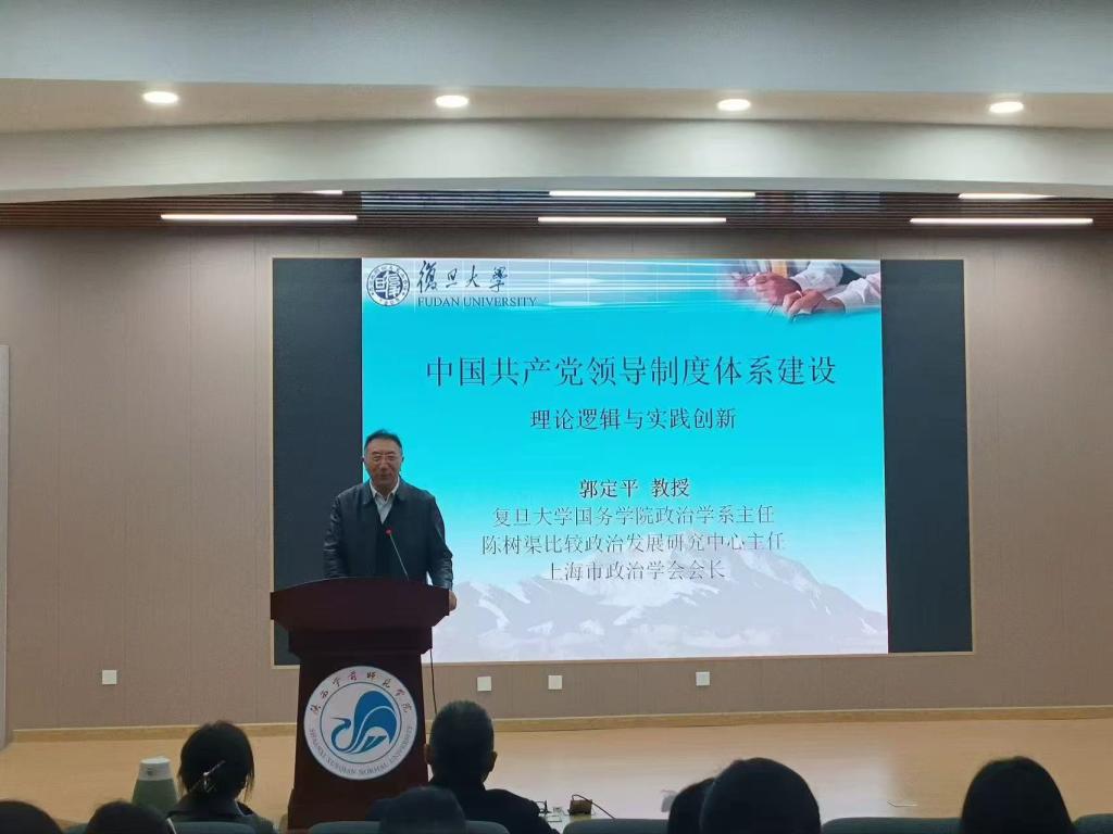 2025年10月23日,陕西学前师范学院马克思主义学院特邀上海市政治学会会长、复旦大学国际关系与公共事务学院教授、博士生导师郭定平做客“神禾大讲堂”。郭定平教授以《中国共产党领导制度体系建设的理论逻辑与实践创新》为题开展专题报告。报告会由马克思主义学院副院长常朝阳主持。马克思主义学院师生参加了报告会。
